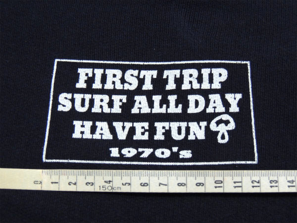 左胸に【FIRST TRIP / SURF ALL DAY / HAVE FUN 1970's】のロゴプリント(W12㎝×H6㎝)が入っています。