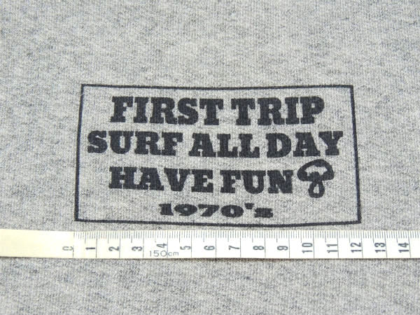 左胸に【FIRST TRIP / SURF ALL DAY / HAVE FUN 1970's】のロゴプリント(W12㎝×H6㎝)が入っています。