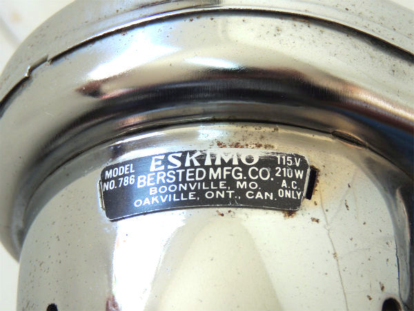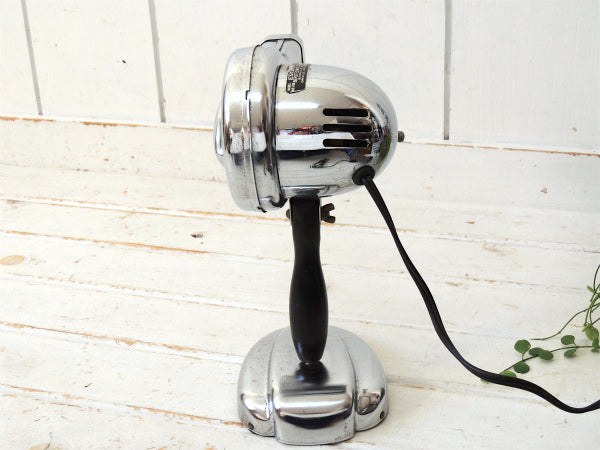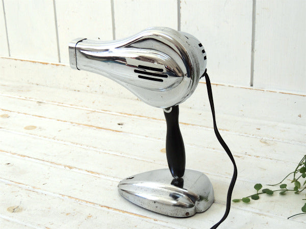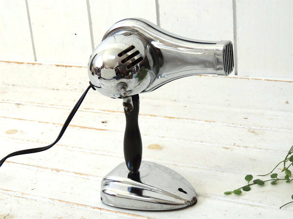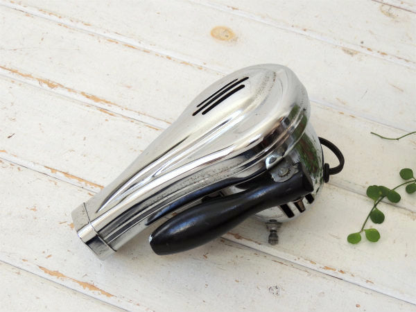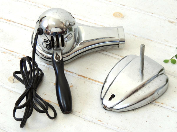アメリカ西海岸・サンフランシスコで見つけました・・『Eskimo Bersted MFG. CO.』のクロム製・ヴィンテージ・ヘアドライヤーです。 1950年代 スペイシー&ミッドセンチュリー ドライヤー&台座はミラーのようなクロムメッキ製で、黒色の木製ハンドルは折り畳みできます。 台座が付いており、ハンディ式でもスタンド式でもお使いいただけます。 台座にビス穴があり、壁に取り付けても使用可能です。 モーター上部のプレートに【ESKIMO BERSTED MFG. CO. BOONVILLE, MO. OAKVILLE, ONT, CAN./ MODEL NO.786 / 115V 210W A.C. ONLY】が付いております。 コンセント式、【Hot/Cold】の回すタイプのスイッチがございます。 ※ON/OFFのスイッチはございません。 お部屋やドレッサー上のインテリア・・ヘアサロン(美容室)やBARBERバーバーショップ(理容室)などの店舗ディスプレイ・・コレクションなどに・・♪ 美品ですが、経年による多少のヨゴレ・スリキズ・サビ等ございます。 画像(写真)でのご判断を宜しくお願い致します。 ■SIZE  :約 W22㎝×D12.5㎝×H28㎝ ■電圧 :115V 210W ■コードの長さ :約162cm ■コンディション : ★★★★☆ ◾️電気用品安全法は日本規格のソケットやケーブルへの交換だけでなく、定められたいくつもの検査と確認を行うことでクリアする事ができます。弊社で取り扱うヴィンテージ照明は、いずれも電気用品安全法(経済産業省)に基づいた適正な部品への交換を行っておりません。 電気用品としてではなく、ディスプレイとしてお楽しみください。 ご理解ご了承よろしくお願い致します。