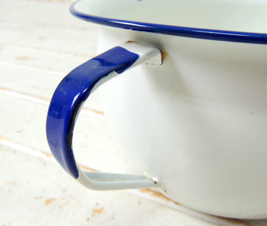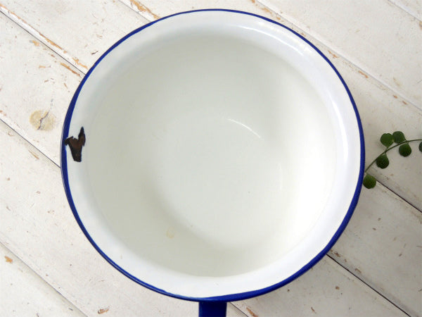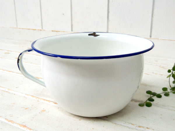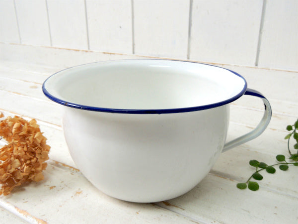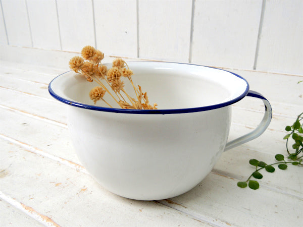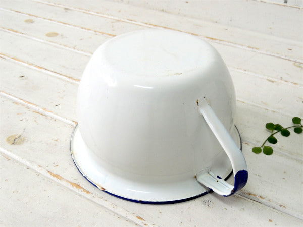 ホワイト×ブルー・ホーロー製・ハンドル付き・ヴィンテージ・ボウル・ワンハンドルボウル・琺瑯ボウル・大