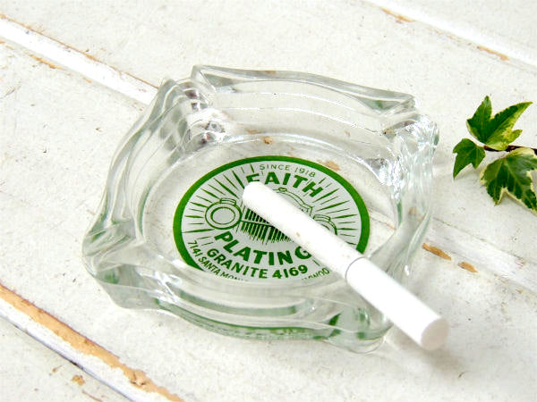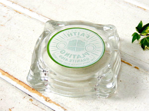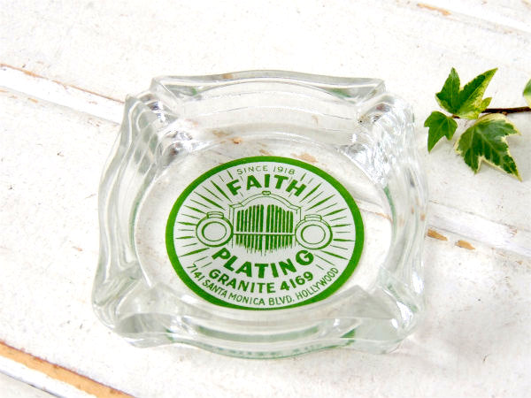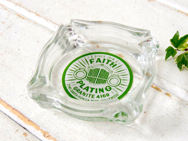 アメリカ西海岸・ロサンゼルスで見つけました・・自動車関連・SINCE 1918・FAITH PLATING・GRANITE 4169・7141 SANTA MONICA BLVD. HOLLYWOOD・アドバタイジング・ガラス製・ヴィンテージ・灰皿(アシュトレイ)です。