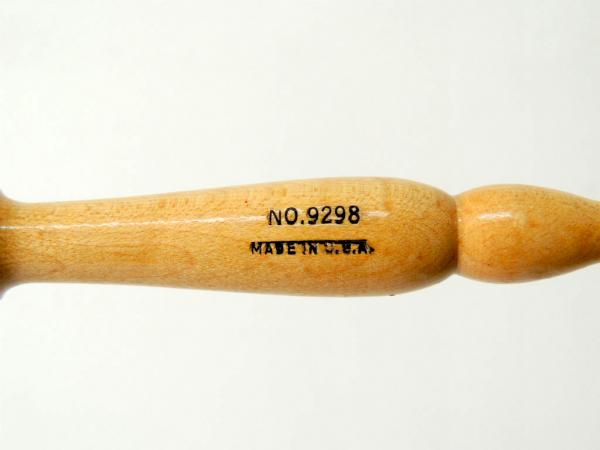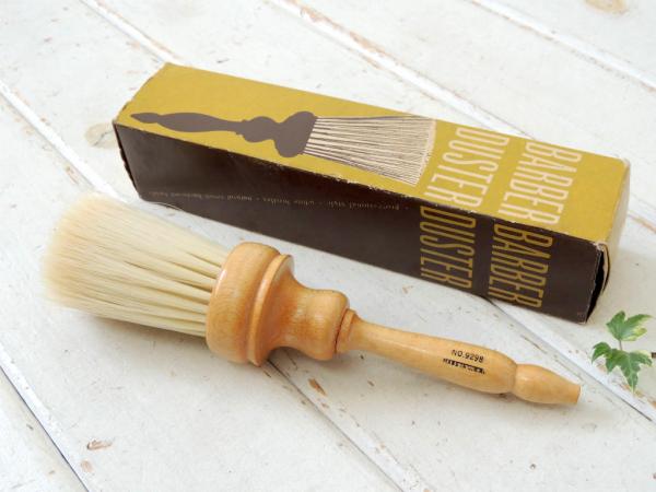 ハンドルに【NO.9298 MADE IN U.S.A.】、箱に【BARBER DUSTER / SEARS, ROEBUCK AND CO., MADE IN U.S.A. /professional style・white bristles・natural finish hardwood handle】と文字が入っています。