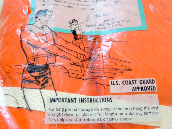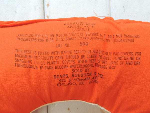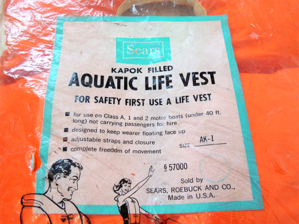 パッケージに【Sears KAPOK FILLED / AQUATIC LIFE VEST / Sold by SEARS, ROEBUCK AND CO., Made in U.S.A.】、ライフジャケットに【TYPE 1 MODEL AK-1(ADULT) LOT NO.590 】のプリントが入っています。