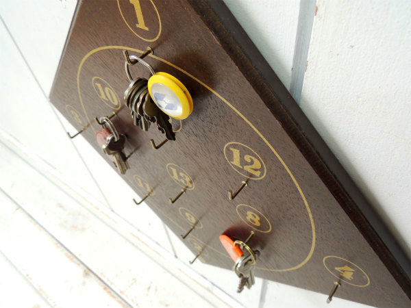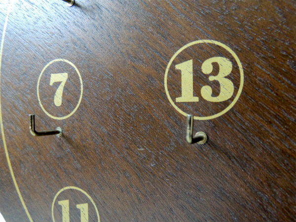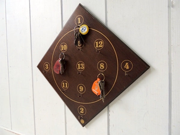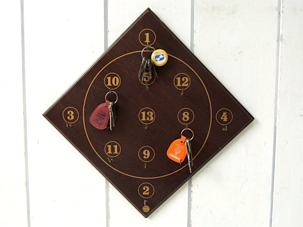 ずっしりと重みのある木製ボードに、①〜⑬の数字が書かれており、それぞれにフックが付いております。