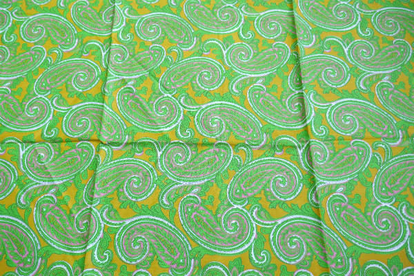 マスタードイエロー色ベースに、黄緑×ピンク×白色のカラフルなペイズリー柄プリントです。