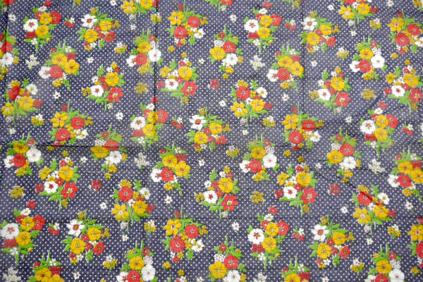 ネイビー×ホワイトの小さな水玉ベースに、花束ような黄×赤×白色のカラフルな花柄プリントです。
