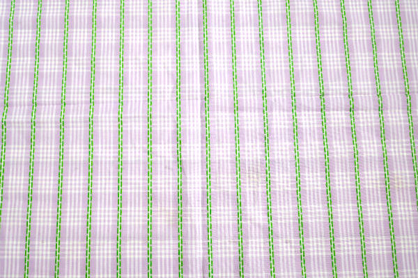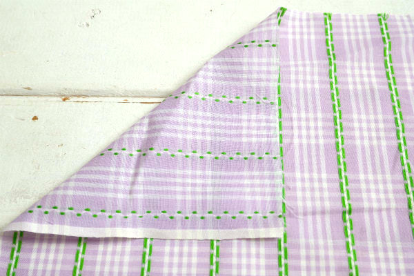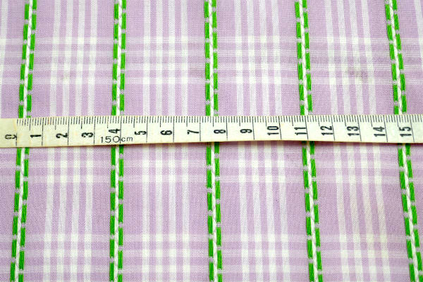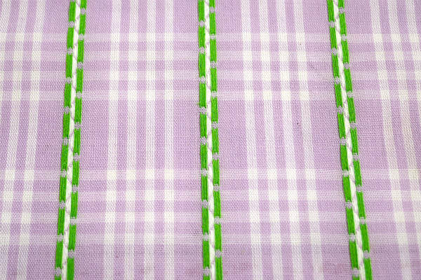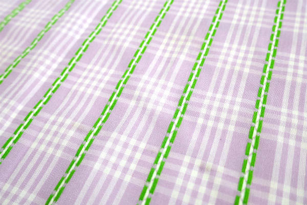 ラベンダーパープル×ホワイトのチェック柄ベースに、黄緑&白の刺繍ステッチがストライプ状に施された、めずらしいデザインです。