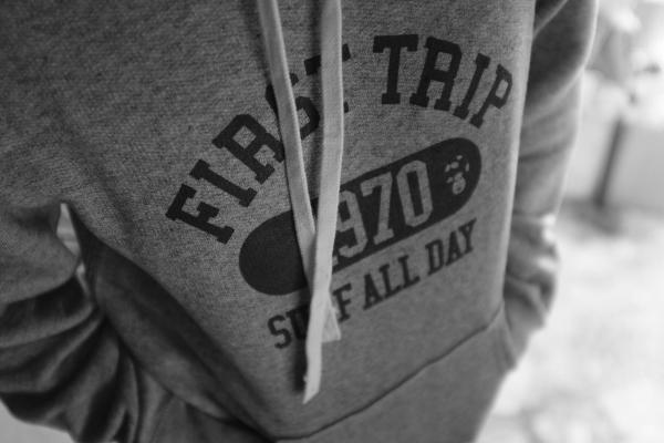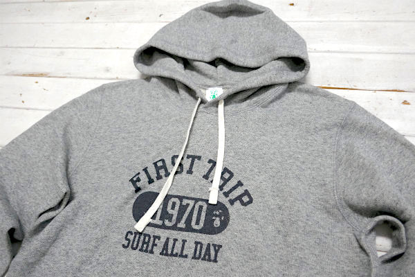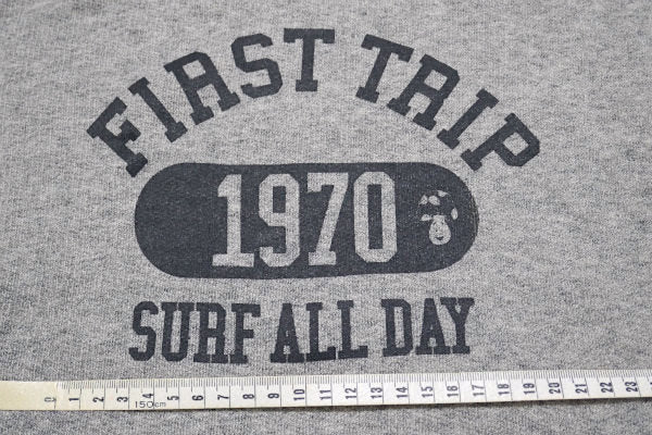 胸フロントに【FIRST TRIP / 1970 /SURF ALL DAY】のロゴプリント(W20.5㎝×H16.5㎝)が入っています。