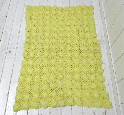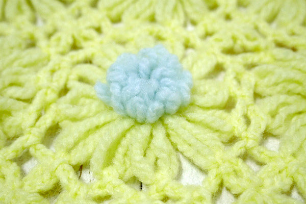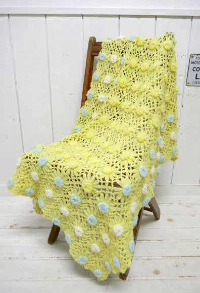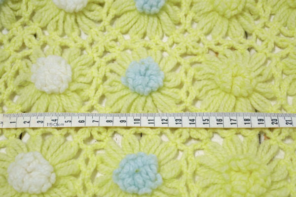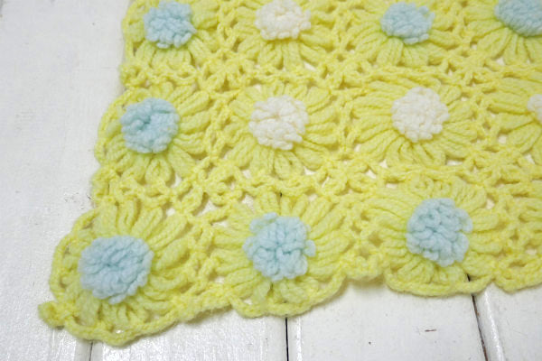 フラワー・立体モチーフ編み・クリームイエロー・ハンドメイド・ヴィンテージ・ニットブランケット USA