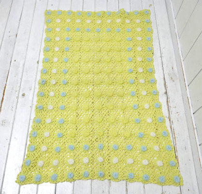 アメリカ中西部・シカゴで見つけました・・クリームイエローのフラワー立体モチーフ編み・ヴィンテージ・ニットブランケットです。