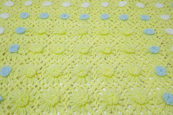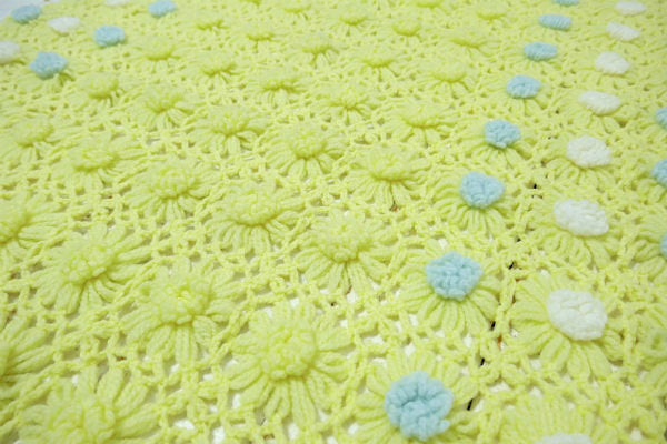 お花の中心部分がプックリと立体的に編まれており、約7cmのモチーフを165個丁寧につなぎ合わせて作られた、とても素敵なブランケットです。