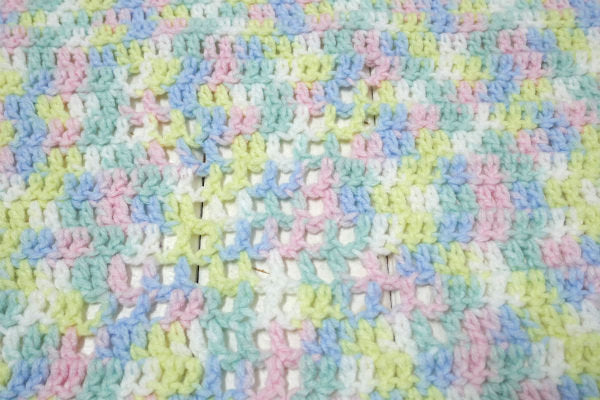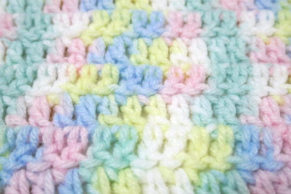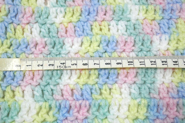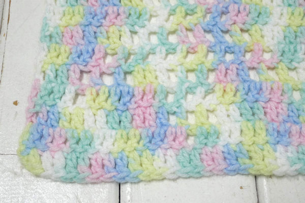 ホワイト×ベビーピンク×ベビーブルー・ミントグリーンのやさしいパステルカラーの配色で、丁寧に編まれています。