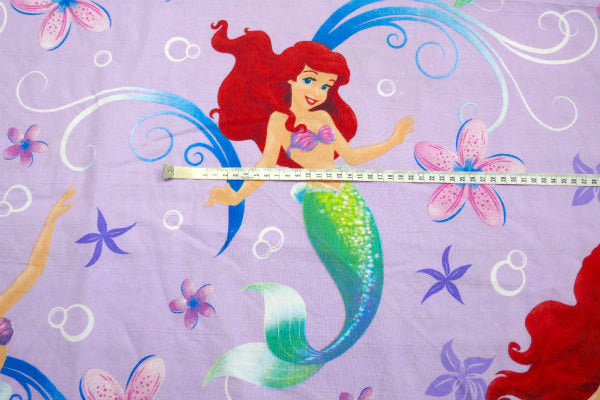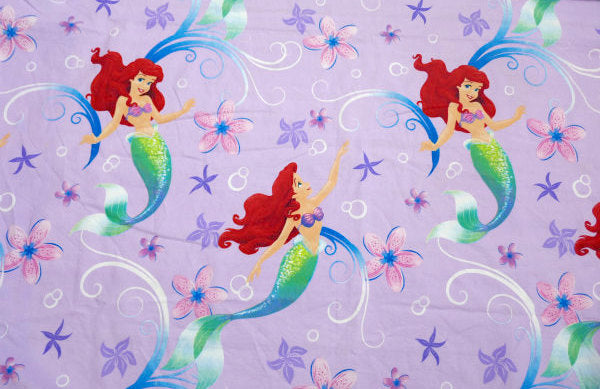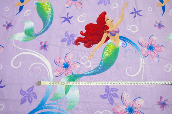 パープルカラーベースに、美しい人魚のアリエルとカラフルな花柄のメルヘンなプリントです。