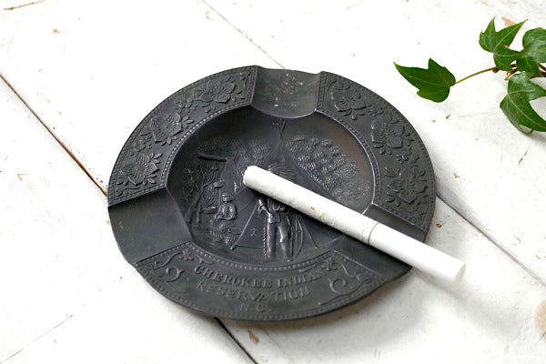 アメリカ西海岸、カリフォルニア州、サンディエゴ〜東へ車で1時間ほどの山あいの小さな街、ジュリアンで見つけました・・CHEROKEE INDIAN RESERVATION N.C. チェロキー・インディアン・アンティーク&ヴィンテージ 灰皿・アシュトレイです。