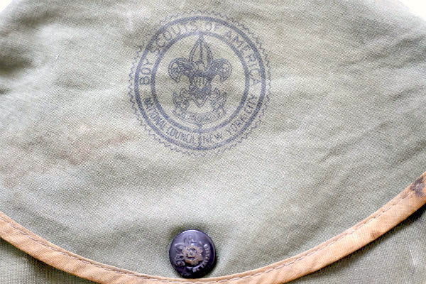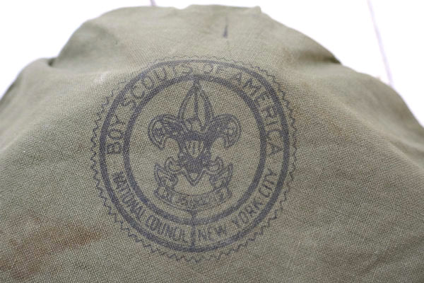 ミリタリーグリーンのキャンバス地専用ケースに【BOY SCOUTS OF AMERICA / NATIONAL COUNCIL NEW YORK CITY】のプリント、スナップボタンに紋章ロゴ&【BE PREPARED(ボーイスカウトの標語“備えよ常に” )】のエンボス、フライパンのハンドルに【BOY SCOUTS AMERICA / THE OFFICIAL BOY SCOUT / BE PREPARED】の刻印が入っております。
