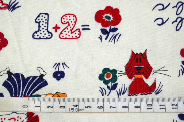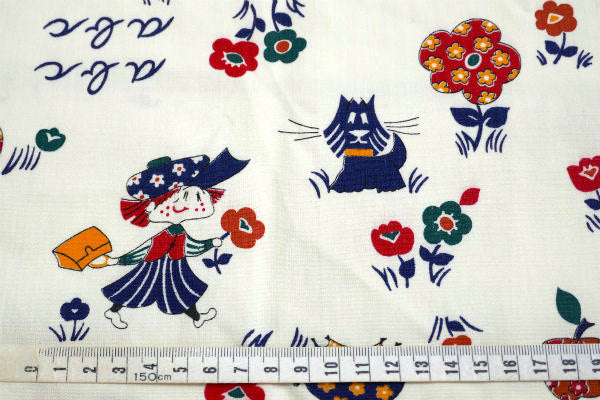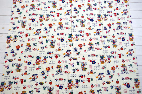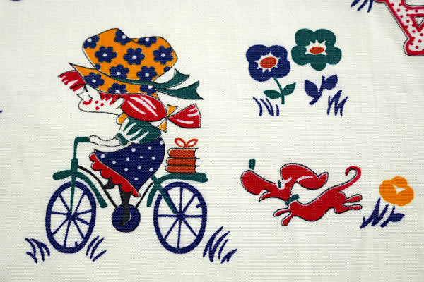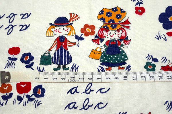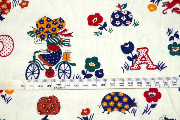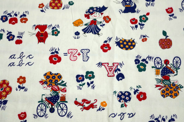 1970年代 オフホワイト地ベースに、花柄のボンネットを被って自転車に乗っている女の子・バッグとお花を持ったワンピース姿の女の子・お花・犬・ブタ・abcのアルファベット・1+2の数字など、どこを取ってもレトロ可愛い総柄プリントです。
