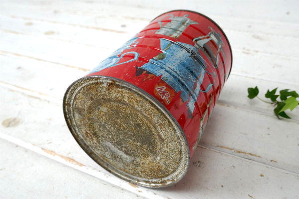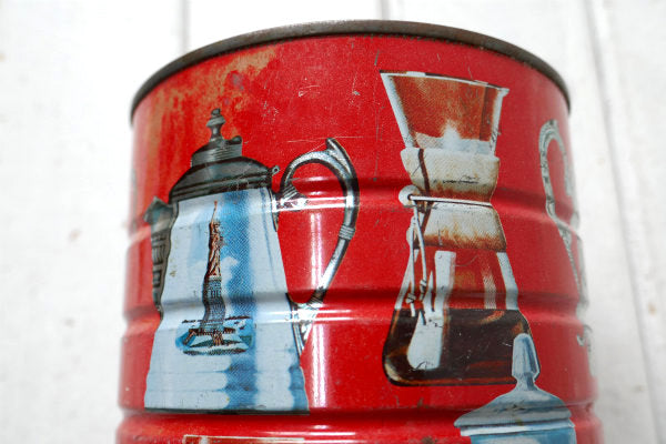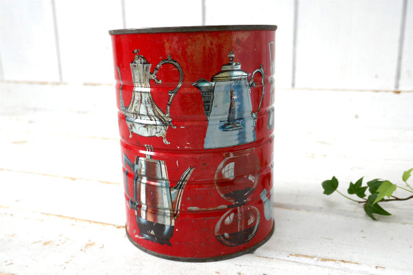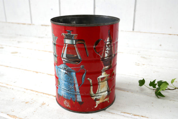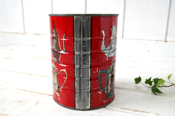 コーヒーが入っていたと思われる筒型のブリキ缶で、レッドカラーのボディにたくさんのコーヒーメーカー柄が入っております。