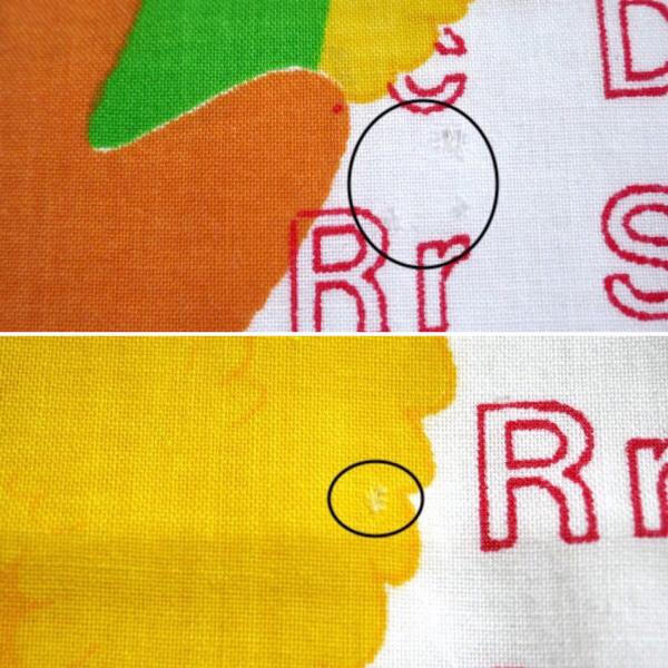 プリントの発色良く、生地もしっかりとしておりますが、数箇所に小さなヤブレ穴が見られます。