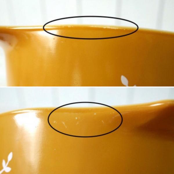 経年による多少のヨゴレ・側面に小さなペイントロス箇所・蓋内側リムに約1.5㎝程の欠け&蓋の持ち手片方に擦れが見られます。