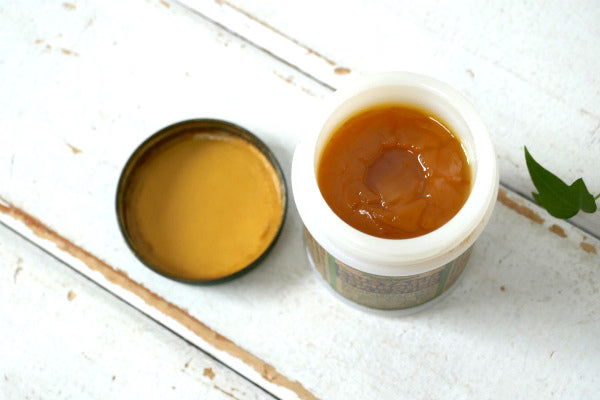 蓋はグリーン・ミルクガラスのボトルに紙ラベルが付いており、たくさんの文字が入ったノスタルジックな雰囲気漂うパッケージです。