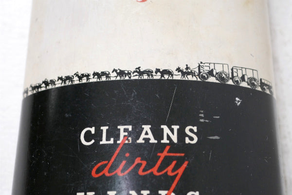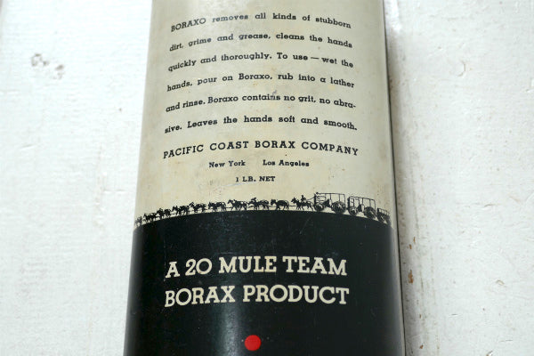 ブラック×アイボリーベースの楕円型ボディに、馬車モチーフ&【BORAXO CLEANS dirty HANDS / PACIFIC COAST BORAX COMPANY New York Los Angeles】など、たくさんの英文字プリントが入った、クールなパッケージです。