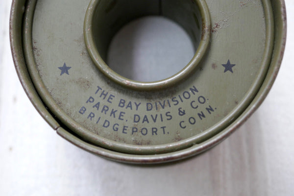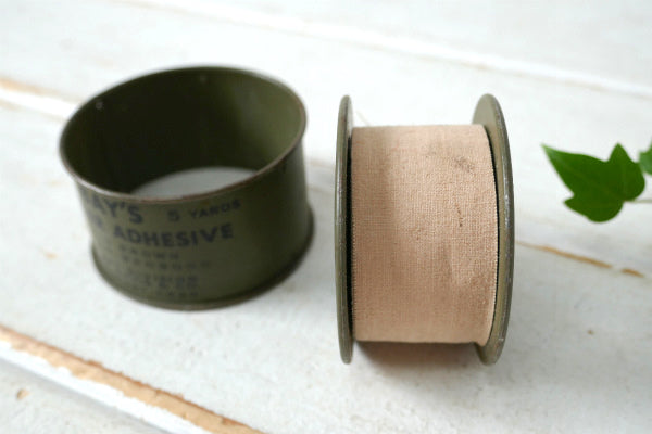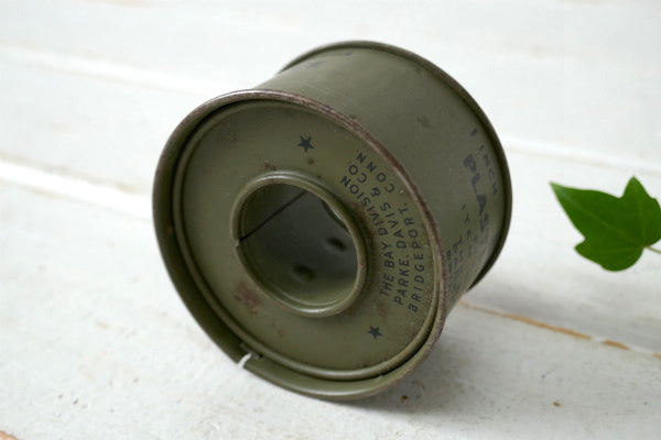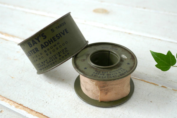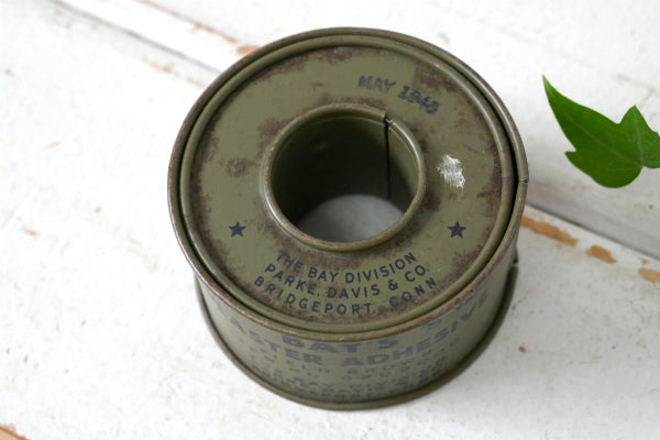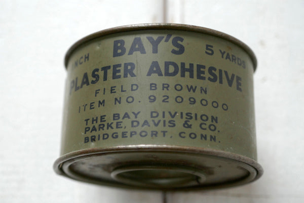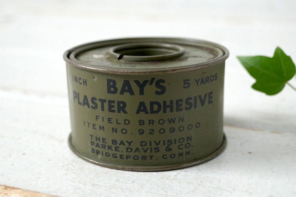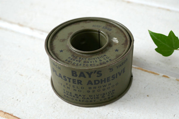 アメリカ中西部・シカゴで見つけました・・『THE BAY DIVISION PARKE, DAVIS&CO.』の【BAY'S PLASTER ADHESIVE】メタル製・ヴィンテージ・テープ缶です。 1945年製 米陸軍医学部と第二次世界大戦の医療関係者が使用していた、医療用の粘着テープが入っていた、カーキカラーのドーナツ形の缶になります。