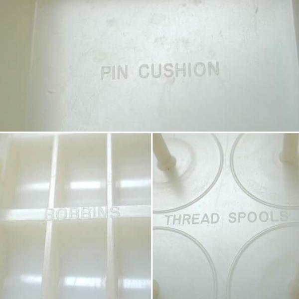 お裁縫箱の内側は2段式で、内側のトレイにはスプールホルダーやボビンホルダーなど、9個の仕切りがあり、左右2箇所に【THREAD SPOOLS】・【RULER TAPE MEASURE】【NEEDLES】【PINS】【PIN CUSHION】【BUTTONS】【BOBBINS】【THIMBLES】など、それぞれに小さなエンボス文字が入っております。