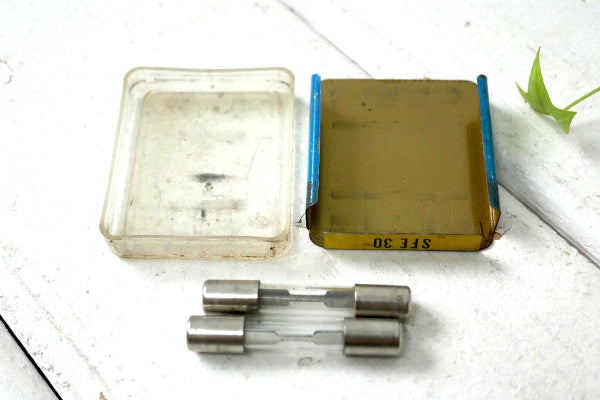 アメリカ西海岸、カリフォルニアで見つけました・・『BUSSMANN MFG. CO.』の【BUSS GLASS TUBE FUSES】SFE 30 小さなヴィンテージ・ヒューズ缶(ヒューズ入り)です。