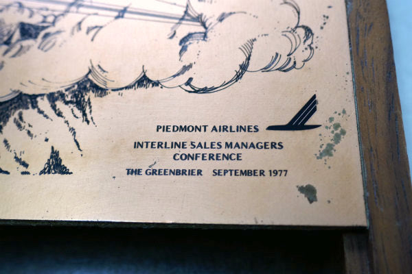 厚紙製カバーに、飛行するピードモント航空の機体の絵柄&【PIEDMONT AIRLINES INTERLINE SALES MANAGERS CONFERENCE THE GREENBRIER SEPTEMBER 1977】の文字が刻まれております。