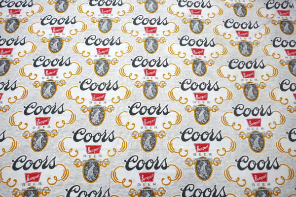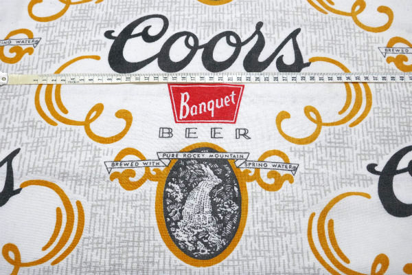 ホワイトベースに、“Coors Banquet BEER / BREWED WITH PURE ROCKY MOUNTAIN SPRING WATER(ロッキー山脈のお水で純粋に醸造しました)”のロゴがたくさん入った総柄プリントです。