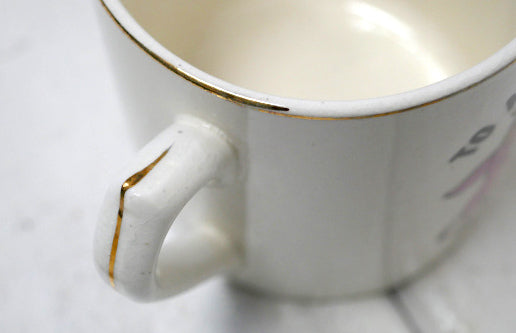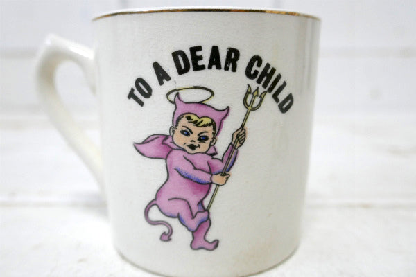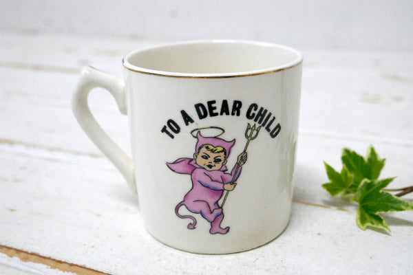 子供用サイズの小さなマグカップで、表面に【AQUARENA SAN MARCOS TEXAS】の文字と人魚のキャラクターの絵柄、背面に【TO A DEAR CHILD(親愛なる子供へ)】の文字と、ユニークなデビルの絵柄が入っております。