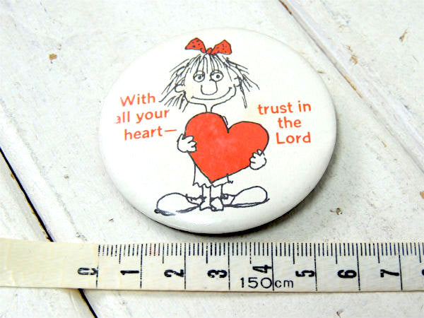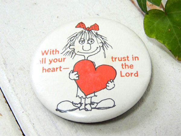 アメリカ西海岸・カリフォルニア・ロサンゼルスで見つけました・・ ”Withh all your heart trust in the Lord ”ハート 女の子 ヴィンテージ・缶バッジです。