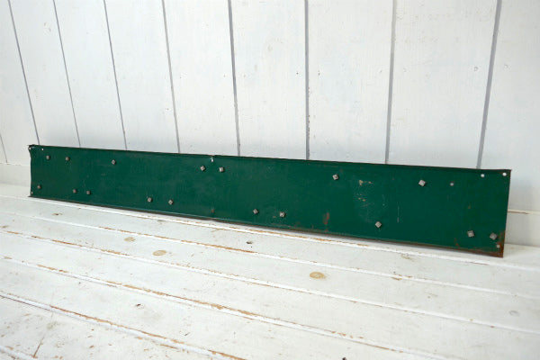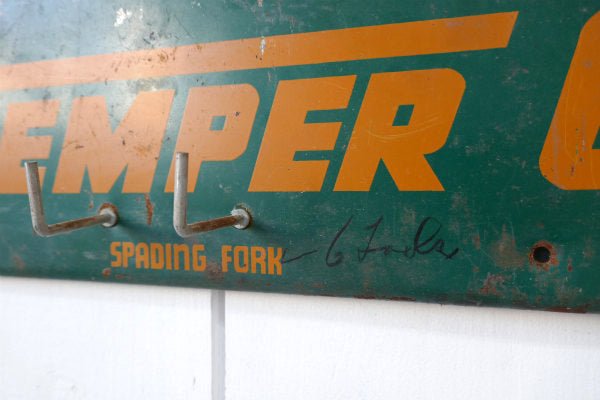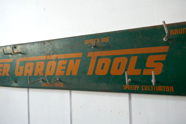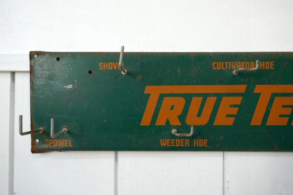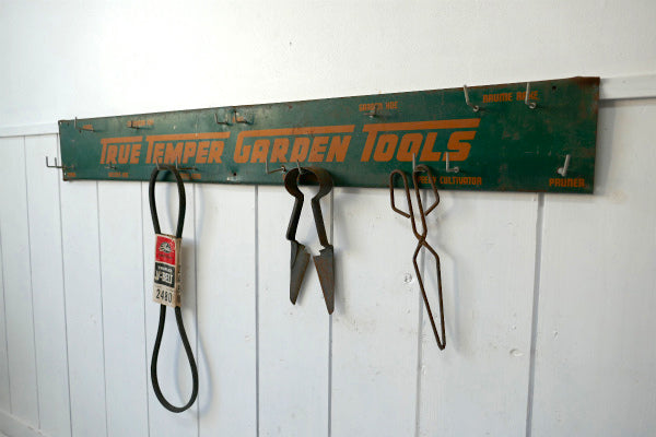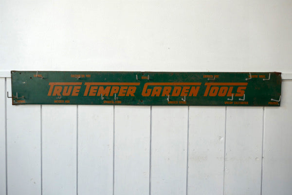 グリーンのメタル製サインに、オレンジ色で【TRUE TEMPER GARDEN TOOLS】の大きなロゴが入っており、【SHOVEL】【CULTIVATOR HOE】【RAKE】【GARDEN HOE】【BRUME RAKE】【TROWEL】【WEEEDER HOE】【SPADING FIRK】【GARDEN SPADE】【SPEEDY CULTIVATOR】【PRUNER】のツール名とフック全17個が付いております。