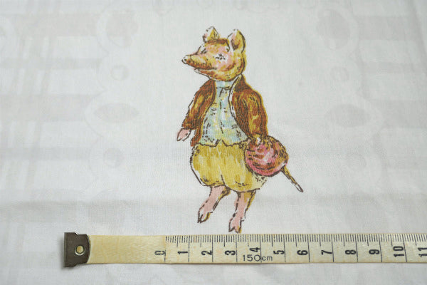 ホワイトベースのレース柄生地に、主人公の“ピーターラビット”・ピーターの3妹“プロプシーモプシーカトン テール”、いじわるネズミの“ハンカ・マンカ”、“あひるのジマイマ”、ハリネズミの“ティギーおばさん”、カエルの“ジェレミーフィッシャーどん”、ブタの“ピグリン・ブランド”、“こねこのトム”&“ミトンとモペット”など、絵本から飛び出したような優しいタッチの総柄プリントです。