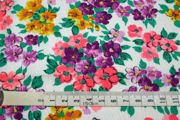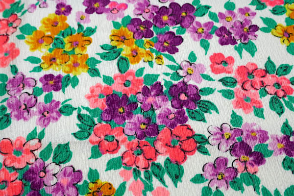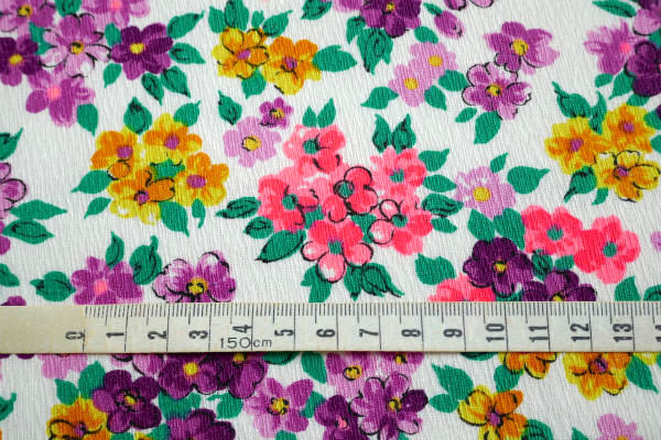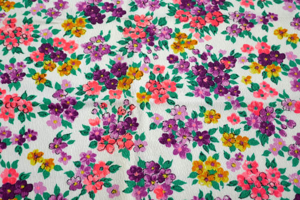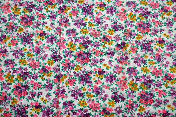 ホワイト地ベースに、ピンクやイエロー・パープルの、カラフルな手書きタッチの小花柄が敷き詰まった、総柄プリントです。