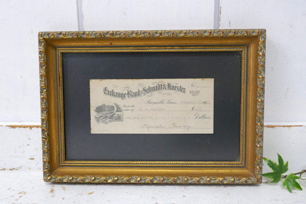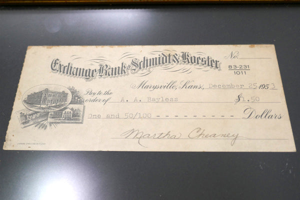 細やかなリーフ柄エンボス模様入りのゴージャスな木製フレーム内に、カンザス州の銀行【Exchange Bank of Schmidt & Koester】の1953年・$1.50チェック(小切手)が入っています。
