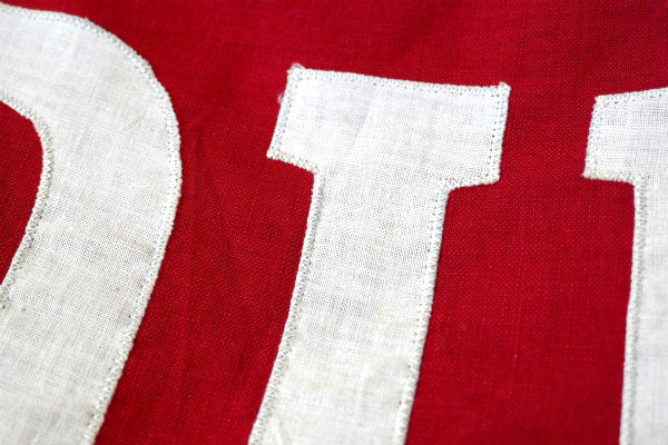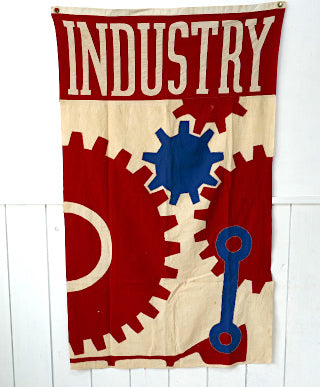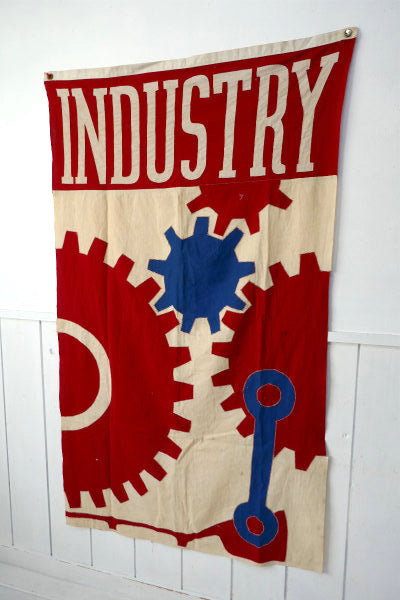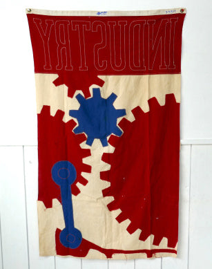 フラッグ上部に【INDUSTRY】の文字、3個の歯車(ギア車輪)や工具モチーフのステッチが施されています。