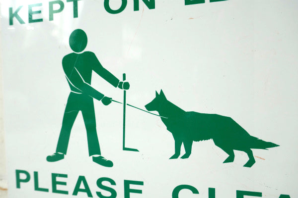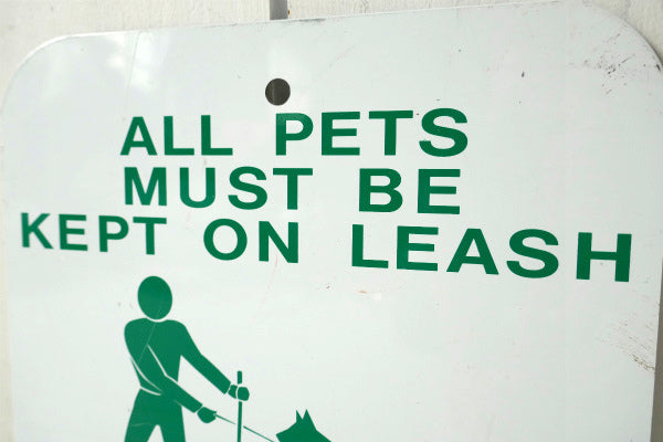 ペットをリーシュに繋いだイラストと共に、“ALL PETS MUST BE KEPT ON LEASH(全てのペットをリーシュに繋いで下さい)”、“PLEASE CLEAN UP AFTER YOUR PET(ペットの後始末をお願いします。)”、の2つのお願い(注意)が書かれています。