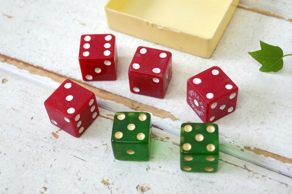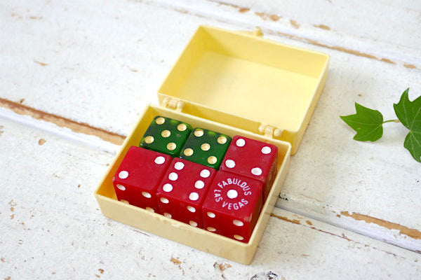 ラスベガスと言えばカジノの本場、サイコロの出る目を当てるゲーム“クラップス”はカジノの中でブラックジャック・ルーレット・バカラに並びとても人気です。 クリーム色のプラスティック製ケースの中に、赤色の6面サイコロが4個、グリーンの6面サイコロが2個入っております。