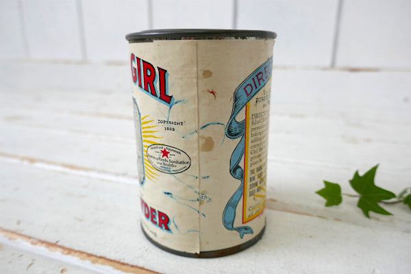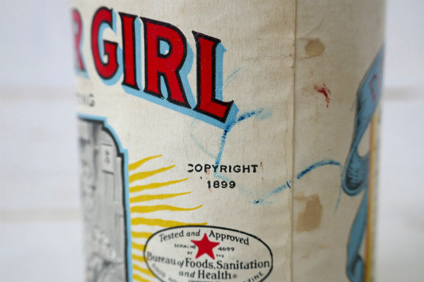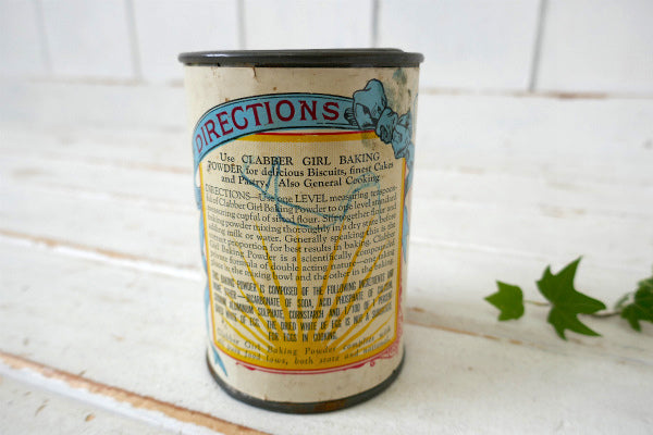 ティン製ボディに白色の紙ラベルが付いており、女の子がスコーンを持っているスケッチの絵柄&【CLABBER GIRL BAKING POWDER DOUBLE ACTING / HULMAN AND COMPANY, TERRE HAUTE, IND.】、背面にはベーキングパウダーを使ったビスケットやケーキ・ペストリーなどの配合が記載されております。