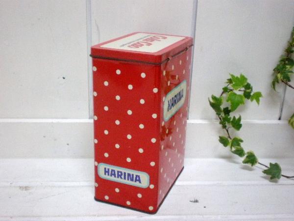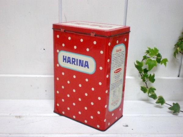 缶のサイドとバックは赤×白のキュートな水玉プリントになっており、『HARINA(小麦粉)』と文字が入っております♪