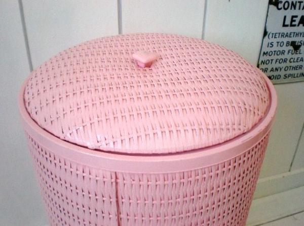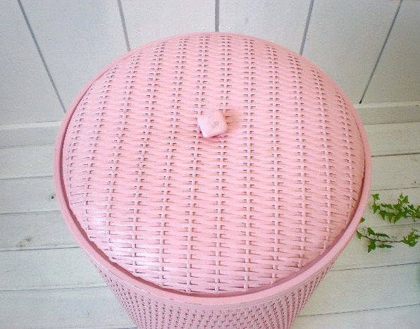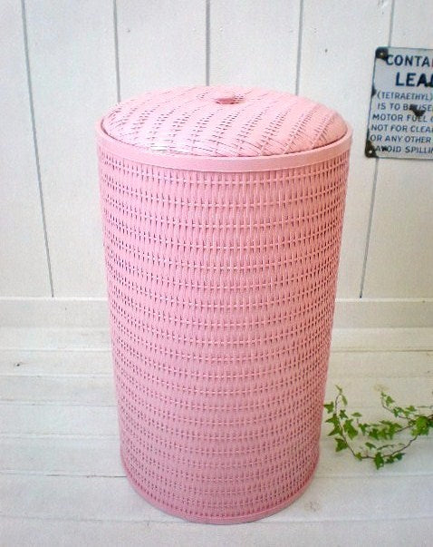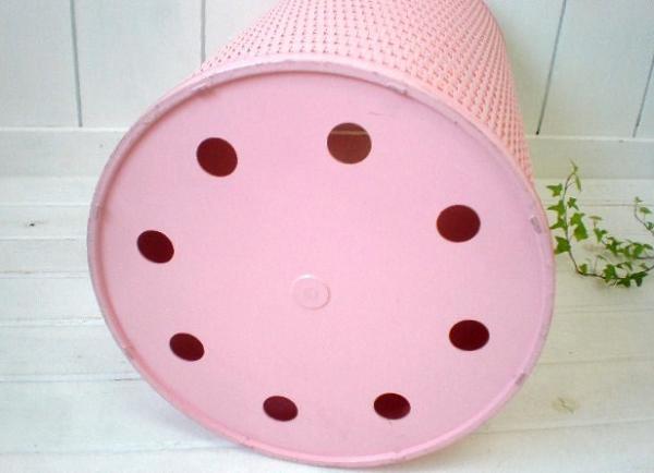 ピンク・筒型 ウィッカー編み・ヴィンテージ・ハンパー・洗濯カゴ・ランドリーバスケット・USA