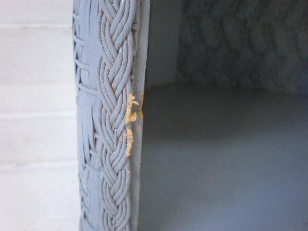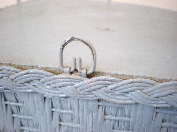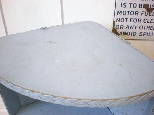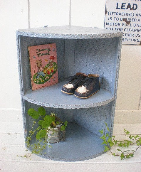 水色のヴィンテージ・ウィッカー編みコーナー・シェルフ/飾り棚