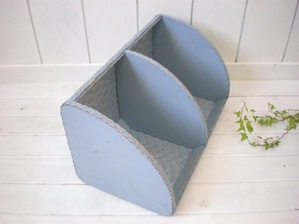 カリフォルニアでみつけました・・淡い水色のヴィンテージ・ウィッカー編みコーナー・シェルフ(飾り棚)です。
