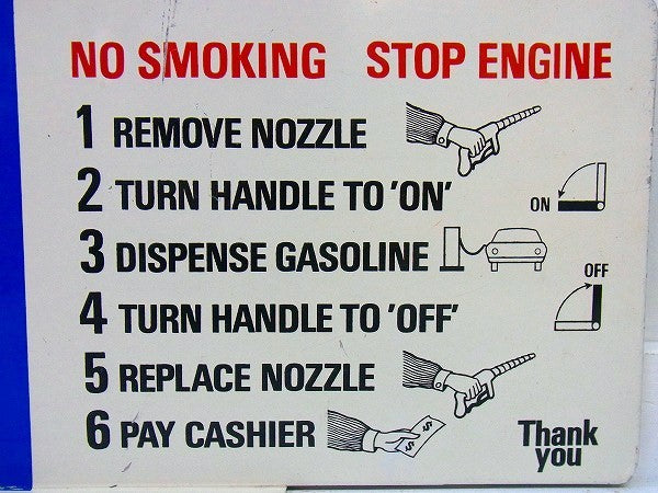 左側に大きく【SELF SERVE】とあり、右側には【NO SMOKING】【STOP ENGINE】の文字や、ガソリンの入れ方がイラスト付きで記載されています。