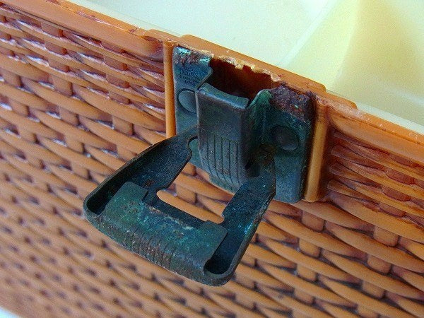 アメリカで見つけました・・『WILSON MFG CO』のバスケット柄・プラスティック製・ヴィンテージ・ソーイングボックス(裁縫箱)です。