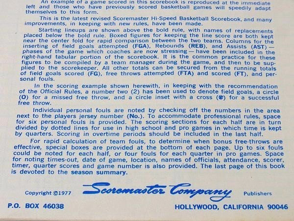 【INSTRUCTIONS FOR USE OF SCOREMASTER HI-SPEED BASKETBALL SCOREBOOK Compiled by Pete Newell Copyright©1977 Scoremaster Company Publishers HOLLYWOOD, CALLIFORNIA 90046】と文字が入っております。