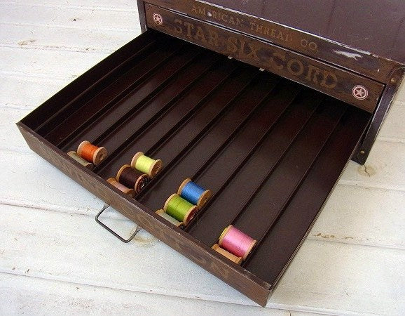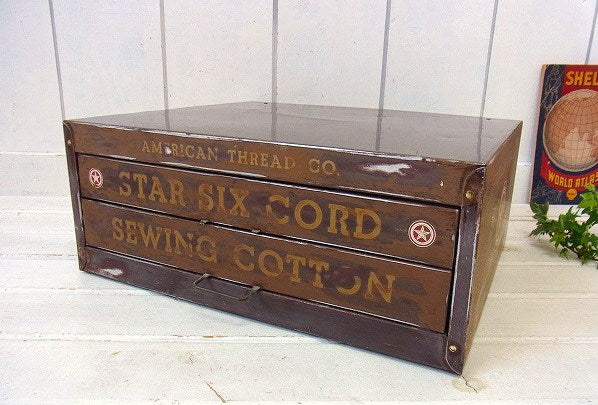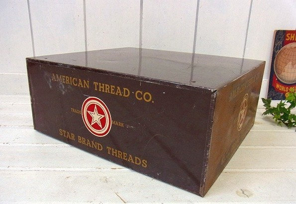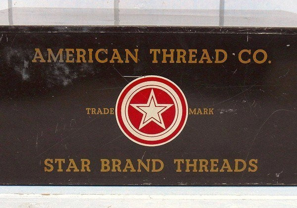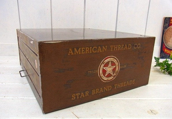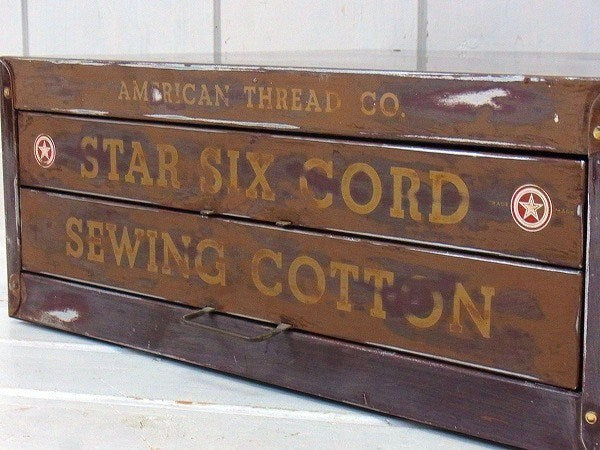 引き出し上段に【STAR SIX CORD】、下段に【SEWING COTTON】、両サイドと背面に【AMERICAN THREAD CO. STAR BRAND THREADS】の文字・★にロゴが入っています。