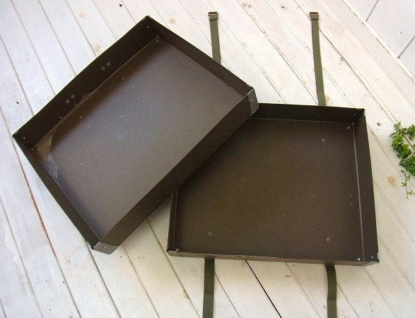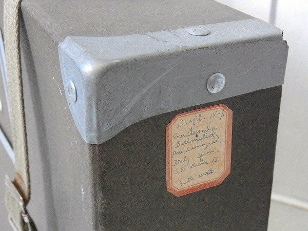 厚紙製で、四つ角はスチールで囲われており、ベルトが付いております。
