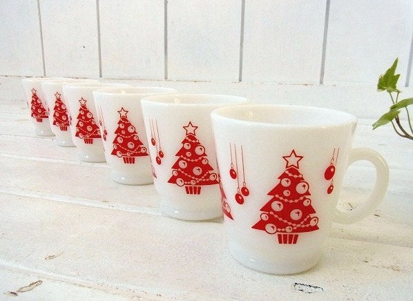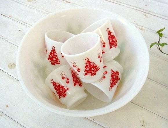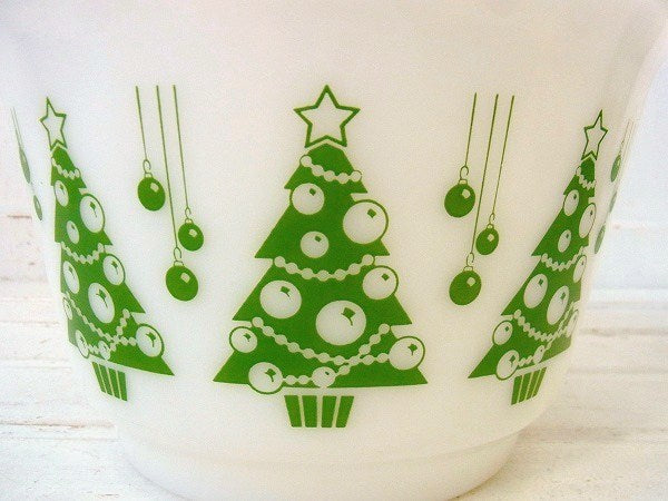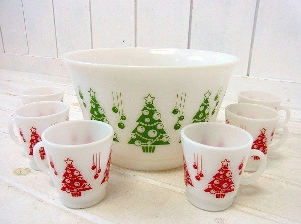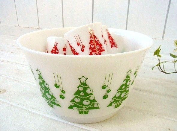 アメリカで見つけました・・『ヘーゼルアトラス(HAZEL ATLAS)社』の、クリスマスツリー柄・パンチボウル1個&マグカップ6脚セットです。